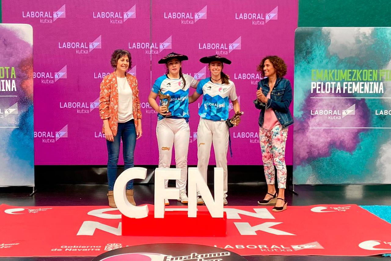 El frontón se ha quedado pequeño en una jornada extraordinaria. Con el aforo completo al 100%, han sido en torno a 300 las personas que se han tenido que quedar sin poder entrar, una auténtica pena, pues no siempre sucede, pero las finales del Torneo Comunidad Foral de Navarra han respondido, con creces, a la expectación creada. En solo tres ediciones, el TCFN se ha consolidado como una de las grandes referencias de la mano femenina y jornadas como las de hoy no hacen sino refrendar la idoneidad del camino emprendido. Rebeca Esnaola, Consejera de Cultura y Deporte del Gobierno de Navarra, ha disfrutado en primera persona de una jornada que se recordará en el tiempo. Aranburu-Lopez, en jóvenes, y Garai-Gaminde, en elites, se han calado las txapelas en dos finales espectaculares.