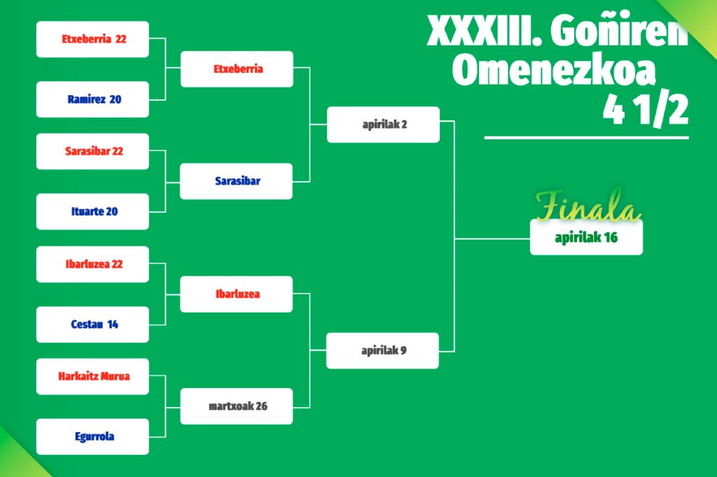 Con esas tres faltas cometidas en mitad de la contienda, el adunarra se ha salido del partido y, aunque ha intentado remontar, Ibarzluea ha aguantado bien la ventaja obtenida y espera al duelo entre Harkaitz Murua y Egurrola de la semana siguiente para ver a quién tiene como rival en semifinales.