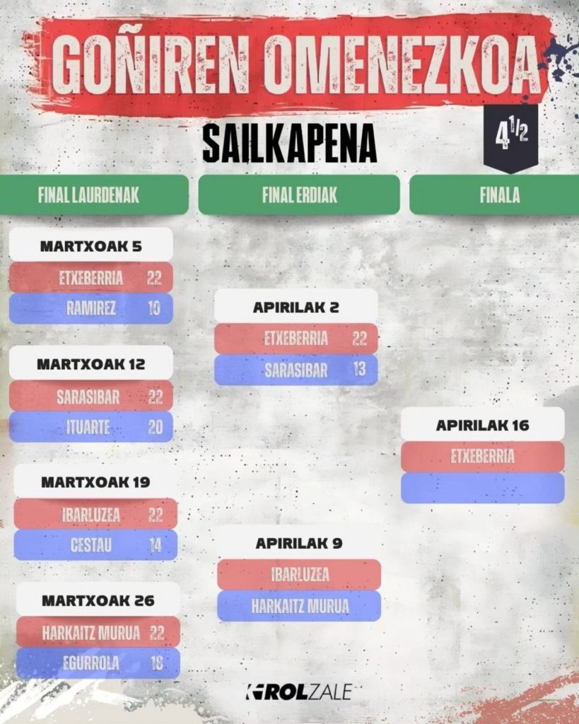 Oiarpe de Oiartzun es uno de los clubes que, en los últimos años ,mejor está trabajando su cantera y fruto de ese trabajo de base, el club de Oarsoaldea puede presumir de que, dos de los tres primeros finalistas del Memorial Goñi, Oihan Etxeberria en la jaula del cuatro y medio y Unax Landa, zaguero de Lizeaga en elites parejas, se han forjado al abrigo del Madalensoro. El delantero se ha impuesto por 22-13 a Andoni Sarasibar, mientras que Lizeaga-Landa han tenido que trabajar a destajo para deshacerse de Fernández y Apeztegia.