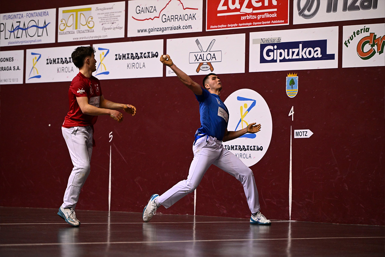 El torneo de Zumarrraga es uno de esos que concede segundas, y hasta terceras oportunidades, y los tres vencedores de hoy parecen dispuestos a aprovecharlas, tras haberse quedado a las puertas de calarse sus codiciadas txapelas. Ya lo dejó claro en su debut en la edición de este año y Eñaut Lizeaga parece decidido a emular a su hermano Ekain, que se hizo con el triunfo final en la edición de 2023 junto a Elola, para lo que ha saltado a la cancha enchufadísimo, adquiriendo gran protagonismo en el juego y haciendo mucho daño a sus rivales con su poderosa volea. Con tantos espectaculares, de potencia, pero también de precisión, el de Mundarro ha impuesto el ritmo del partido y la pareja guipuzcoana ha puesto tierra de por medio desde el inicio (3-7). Unax Landa se ha sumado a la labor de desgaste de Unax Apeztegia y al zaguero de Elizondo se le ha amontonado el trabajo, obligándolo a un ejercicio de resistencia, con poco protagonismo para Jorge Fernández. Así, la pareja azul ha entrado en erupción y han abierto huecos, 5-11 primero y 7-14 después, que parecían decantar el partido.