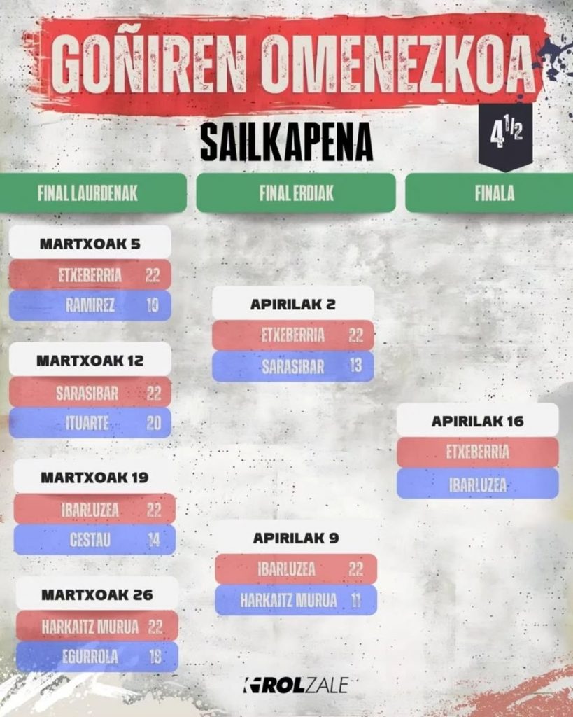 Una vez conocidos los nombres de todos los finalistas, ya ha comenzado la cuenta atrás para el gran día y quienes quieran estar en estas finales ya tienen a su disposición las entradas en kirolzale.eus. Visto el aspecto que han mostrado las gradas en la jornada de hoy, aquellos y aquellas que quieran estar en el Beloki el próximo miércoles ya pueden prisa. Para los que vengan de fuera de Zumarraga, el patio del colegio La Salle situado en justo al lado del frontón estará abierto para que puedan aparcar el coche en él.