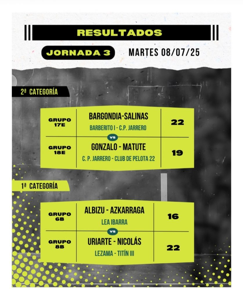 Bargondia (Barberito I) – Salinas (Club Jarrero) 22 vs Gonzalo (Club Jarrero) – Matute (Club Pelota 22) 19