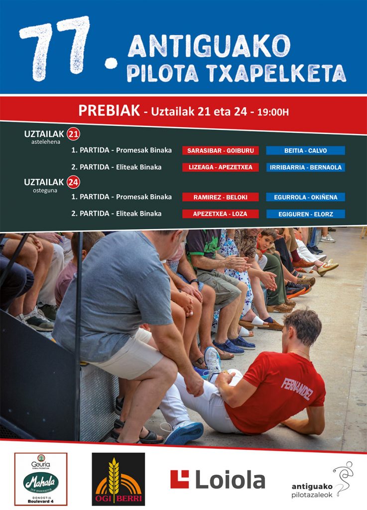 En cuanto al jueves 24 de julio a partir de las 19:00, se jugarán los dos partidos restantes. Unax Ramírez (Kurene) formará pareja con un Eneko Beloki (Gazteleku) que apenas está jugando este último año, pero que después de haber salido campeón hace dos años, le han querido dar la oportunidad de ver si es capaz de ir cogiendo confianza después de estar pasando una muy mala época con las manos. Sus rivales, en este duelo de promesas serán Mikel Egurrola (Markina) y Jon Patxi Okiñena (Buruzgain). Veremos cómo se encuentra el guipuzcoano siendo uno de los pelotaris a tener en cuenta por el momento en el que se encuentra. Los otros tres, que este año han sido de edad juvenil, buscarán hacer un papel digno ante la cátedra del Antiguo.
