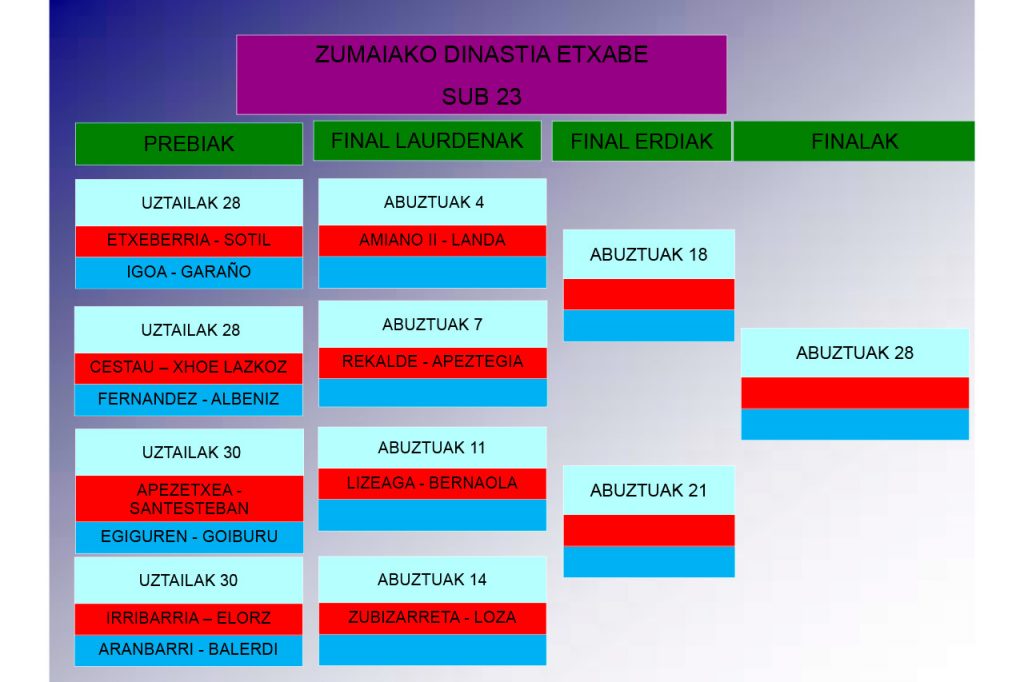 También en el caso de los sub-23 años, la cartelera es de lujo y se pueden ver parejas muy bonitas. Eso sí, en este caso habría que destacar a las cuatro combinaciones que comenzarán su actuación en cuartos de final gracias a su condición de cabezas de serie, ya que Amiano II-Arlanda, Rekalde-Apeztegia, Lizeaga-Bernaola y Zubizarreta-Loza, serían claros favoritos para calarse cualquier txapela. De todas formas, las parejas que disputarán las eliminatorias previas tampoco son cualquiera. En la primera jornada se disputarán los partidos Etxeberria-Sotil contra Igoa-Garaño y Cestau-Xhoe Lazkoz contra Fernández-Albéniz. El miércoles, en cambio, Apezetxea-Santesteban jugarán contra Egiguren-Goiburu e Irribarria-Elorz contra Aranbarri-Balerdi.