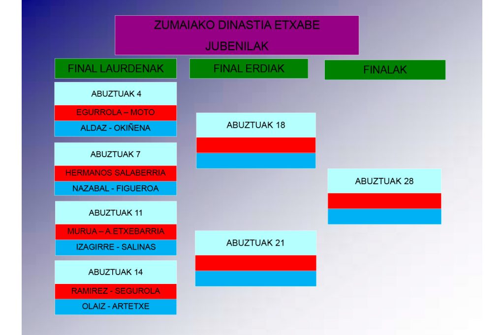Y como en los últimos tres años, el torneo de mano de gran tradición se complementará con un campeonato de cesta punta en el Aitzuri. Históricamente, la pala solía ser la modalidad que se jugaba junto a la mano en Odieta, pero con la fuerza adquirida por la cesta punta en los últimos años en Zumaia, han apostado por la cesta en el moderno Aitzuri. Así las cosas, entre los ocho pelotaris que competirán en las dos semifinales, habrá dos zumaiarras, Cosme Agirre y Unai Uranga. En total, serán 4 pelotaris guipuzcoanos, 3 vizcaínos y 1 de Ipar Euskal Herria.