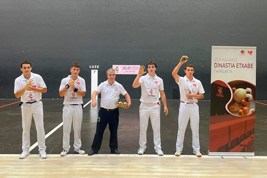 El primer partido de juveniles de esta Dinastía Etxabe no ha respondido a las expectativas, en buena parte porque Okiñena se ha lastimado su derecha bastante pronto y no ha podido ofrecer todo lo que de él se esperaba. La pareja de Buruzgain se conoce y se compenetra a la perfección y ha sido como si los problemas del zaguero hubieran contagiado también a su delantero, que se ha visto muy obligado a tareas defensivas y en ataque no le hemos contado ni un solo tanto terminado.Con todo, el duelo ha tenido un comienzo bastante equilibrado y disputado, con protagonismo de ambos zagueros, que han ofrecido muy buenas prestaciones de zurda, incluso bastante mejores que con sus derechas, mano con la que les ha costado colocarse. Eso sí, desde el primer tanto, el dominio en el marcador ha sido de unos Egurrola-Moto, superiores a su par, tanto adelante como atrás. No obstante, el pelotari que ha roto el partido ha sido Mikel Egurrola. El delantero de Markina ha marcado el ritmo del partido, enredándose adelante y moviendo a Aldaz-Okiñena. Cada vez que el delantero vizcaíno entraba en juego pasaba algo sobre la cancha y ha mostrado un amplísimo repertorio de posturas para terminar el tanto, destacando su efectividad con la dejada, tanto al txoko con efecto, como al ancho. Buenos tantos de gancho, paraditas con efecto y un saque con el que también ha hecho daño han completado la exhibición rematadora de Egurrola.