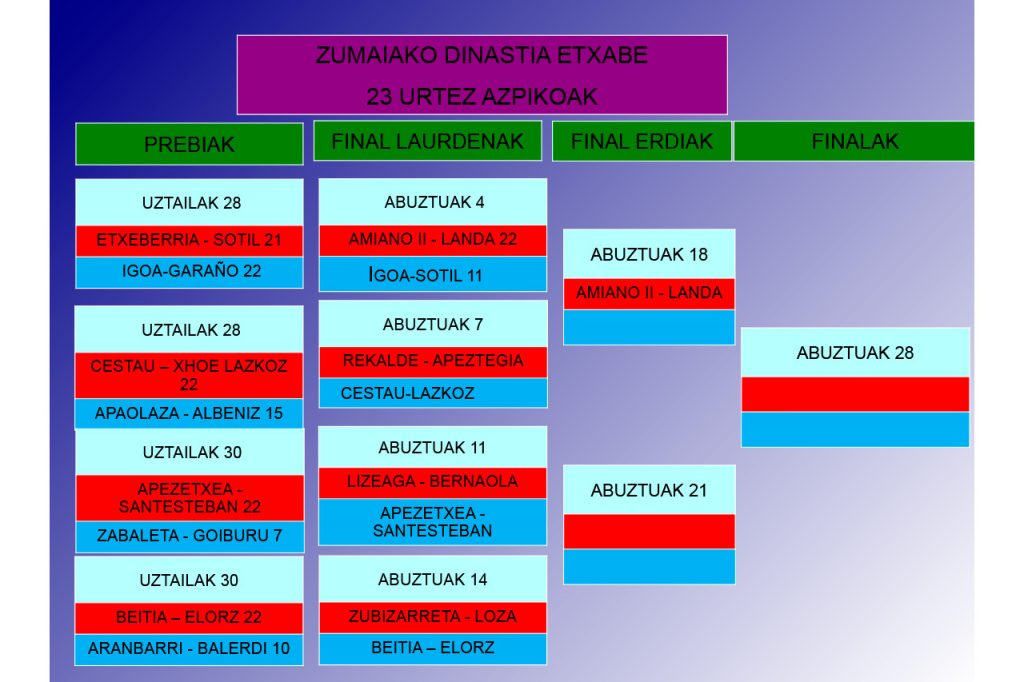 El Dinastía Etxabe ya conoce el nombre de sus primeros semifinalistas; Egurrola-Moto en juveniles y Amiano II-Landa en sub-23, tras imponerse a Aldaz-Okiñena (22-9) e Igoa-Sotil (22-11), en dos partidos que se han decidido antes de lo que el numeroso público que se ha dado cita en las gradas del Aitzuri hubiera deseado. De esta manera, Egurrola-Moto esperan rival del hermanos Salaberria/Nazabal-Figueroa que se jugará el jueves, festival en el que también se cerrará la semifinal del sub 23, con los guipuzcoanos Amiano-Landa a la espera del ganador del Rekalde-Apeztegia/Cestau-Lazkoz.