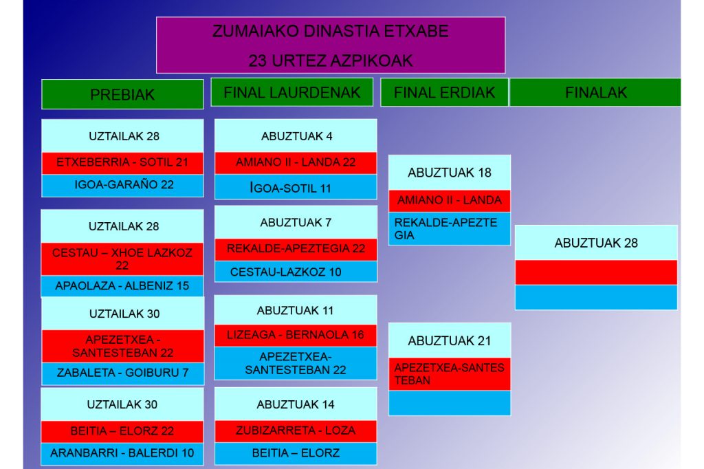 Sin embargo, su delantero, Eñaut Lizeaga ha hecho y deshecho, con preciosos remates, sobre todo de volea y de gancho, pero coon excesivos errores. El de Astigarraga ha sorprendido al público con un sotmano bajo-pata, pero ha sido en esa parte central del duelo cuando se ha enredado queriendo terminar y ha permitido a sus rivales abrir hueco en el marcador. Apezetxea, por su parte, ha estado muy correcto sobre la cancha, sabiendo conducir a su zaguero y aportando una media docena de remates con los que han conseguido el pase a la siguiente fase.