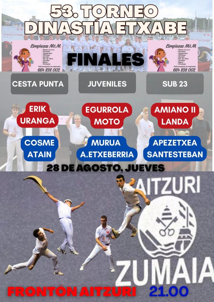 La final de cesta, en su cuarta edición, dará el pistoletazo de salida al último festival del Dinastía Etxabe de este año. Será bonito ver pelear por la txapela local a dos pelotaris que lograron juntos el Interpueblos de Gipuzkoa hace algo más de un mes para Zumaia. En esta ocasión Aguirre formará pareja con Atain y el delantero de Uranga, campeón de la primera edición, será el mutrikuarra Erik.