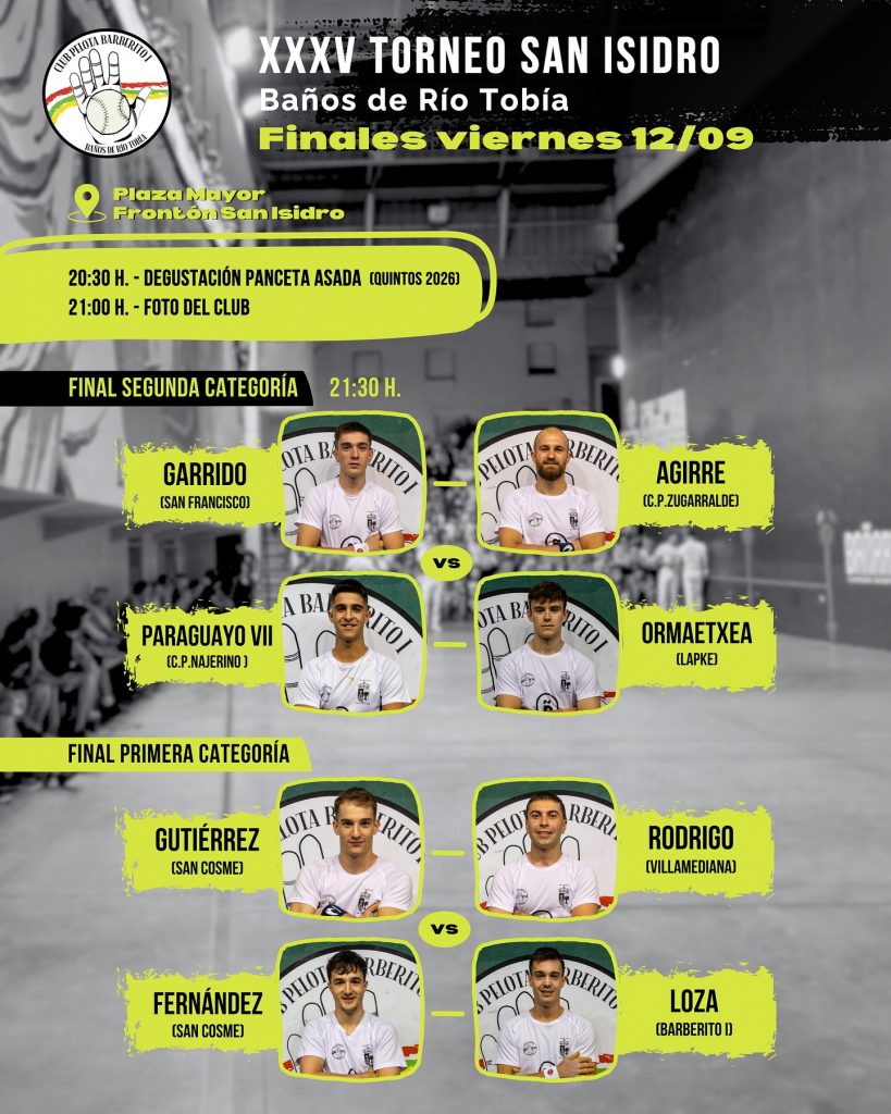 Cartelera de las finales del Torneo San Isidro de Baños de Río Tobía tanto de primera como de segunda categoría.