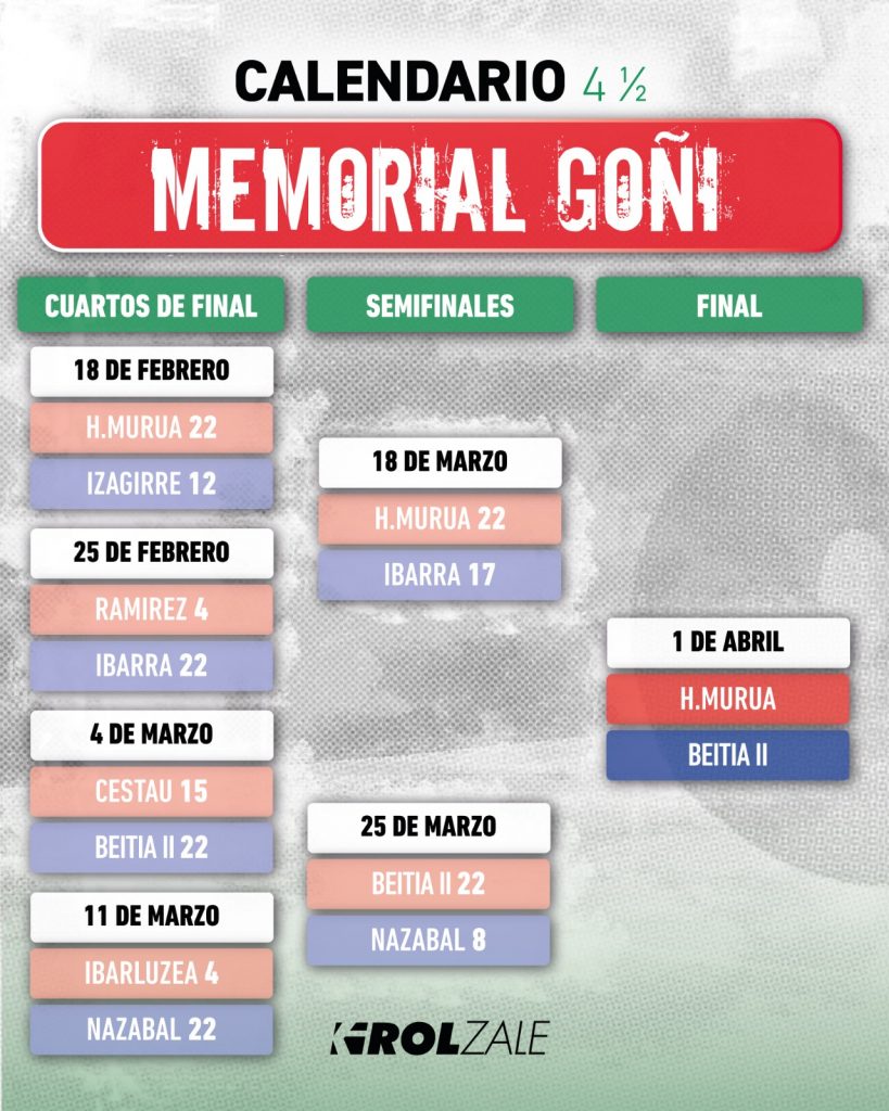El Memorial Goñi ya conoce finalista. Igoa-Bernaola se medirán a Arrilbillaga-Elorz en parejas, Beitia se medirá Murua en promesas.