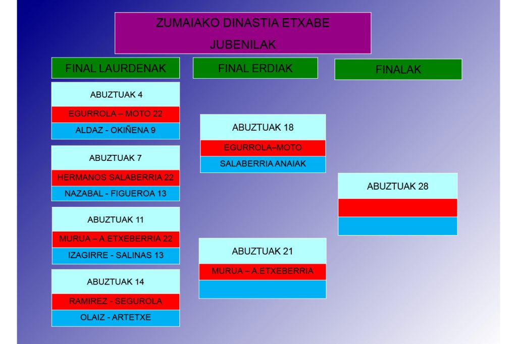 En el partido de juveniles Harkaitz Murua y Aitor Etxeberria han hecho un partido muy serio y se han impuesto con facilidad a Izagirre y Salinas (22-13). Y eso que los azules se han llegado a adelantar 1-4 gracias,al trabajo realizado por Iker Izagirre. El elgoibartarraha salido agresivo a la cancha, moviendo bien la pelota de lado a lado y terminando los tantos. En cualquier caso, el de Altzo y el oiartzuarra han visto rápido que sus opciones de ganar estaban atrás y, se han dedicado, una y otra vez, a castigar a Salinas, logrando no sólo equilibrar el marcador, sino también llegar con ventaja al ecuador (11-7). El riojano ha acumulado bastantes fallos, muchos de ellos por colocarse mal o hacer cosas que no correspondían, pero hay que recordar que Salinas jugaba hasta hace poco de delantero y que, a pesar de haber mostrado tener dos manos muy bonitas, todavía está aprendiendo el oficio de zaguero.