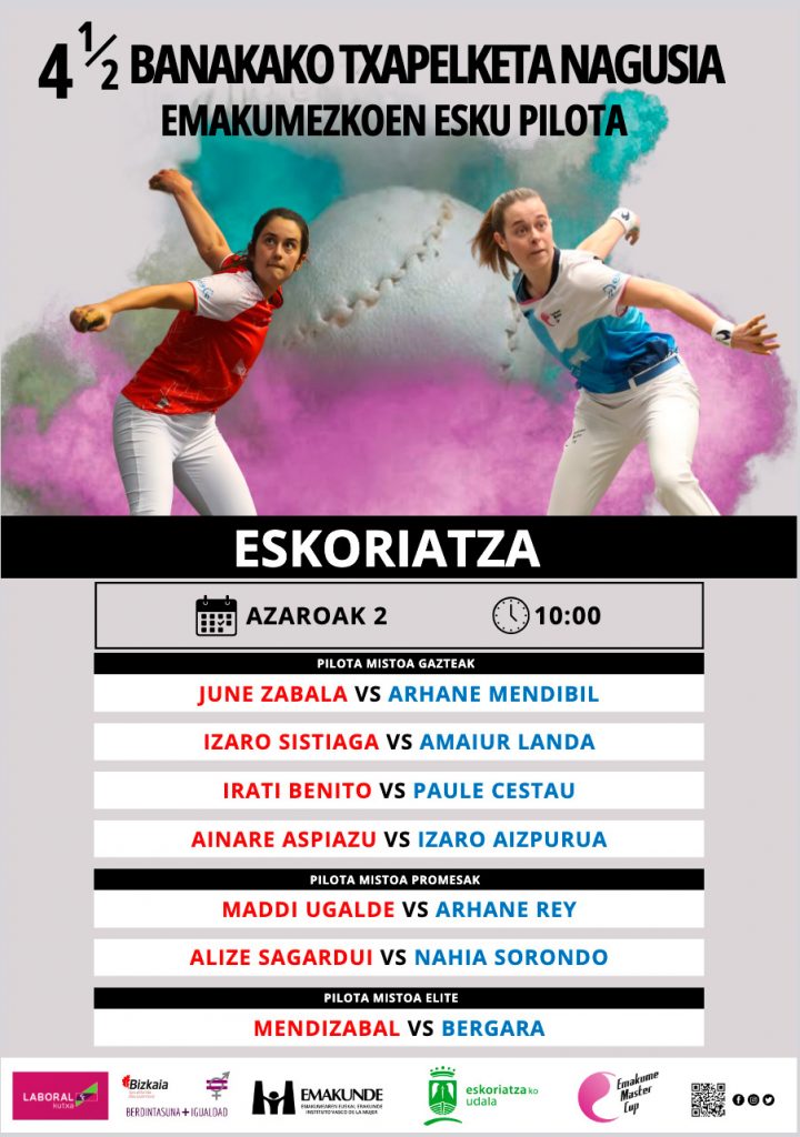 A pesar de que las finales del 21 de diciembre en Bermeo parecen lejanas, el campeonato del Cuatro y Medio femenino también está en marcha y este domingo por la mañana se disputará una eliminatoria de este torneo de la máxima categoría. Nora Mendizabal y Arrate Bergara se enfrentarán en la eliminatoria de la categoría principal, pero como en este campeonato todas las mujeres tienen su hueco, también se jugarán cuatro partidos juveniles y otros dos de promesas, convirtiendo a esta localidad de Debagoiena en un magnífico escaparate de todas las realidades de la pelota femenina actual.