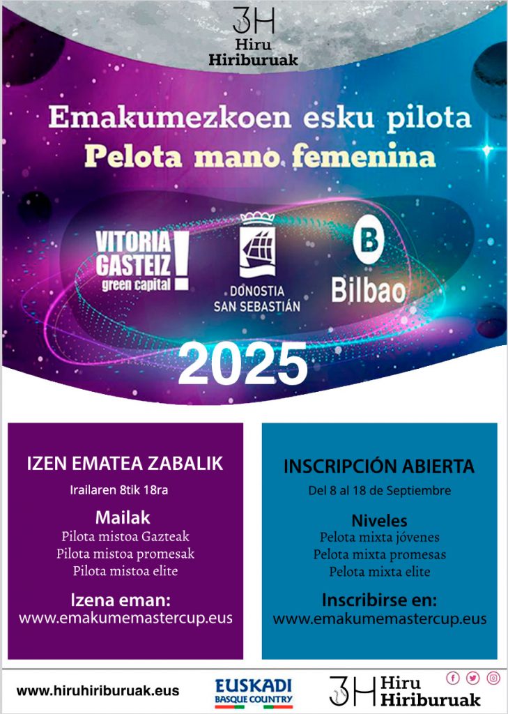 Tras una temporada de verano muy ajetreada, el nuevo curso de la pelota a mano femenina también llama a la puerta y la nueva temporada arrancará con el exitoso campeonato Hiru Hiriburuak, que ya está totalmente enraizado en el calendario. La participación totalmente abierta ha sido uno de los principales pilares de su éxito y, tirando de esa base, en el Torneo Hiru Hiriburuak podrán participar todas las mujeres que lo deseen, sin ningún tipo de limitación, y para ello la inscripción estará abierta del 8 al 18 de septiembre. Todas las mujeres interesadas podrán inscribirse gratuitamente en la página web www.emakumemastercup.eus. Para que cada deportista tenga un campeonato que se adapte a sus necesidades y potencialidades, este año el campeonato se divide en tres categorías, las tres con pelota mixta, en categorías juvenil, promesa y elite.